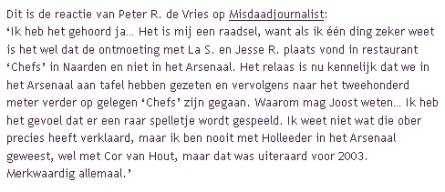 Opvallend is echter dat OvJ H. Oppe, personeel van het Arsenaal zeker wist dat Holleeder aanwezig was en dat zelfs met een bonnetje kon aantonen en dat Peter de Vries klaarblijkelijk in 2007 al had gezegd dat het gesprek niet in het Arsenaal was maar in ‘Chefs’.